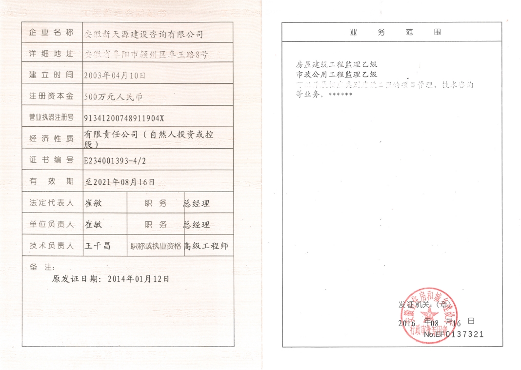 2014年1月取得工程監(jiān)理資質(zhì)證書;現(xiàn)工程招標(biāo)代理及工程造價(jià)已取得甲級資質(zhì),并開展了環(huán)境影響評價(jià)、工程測量、房地產(chǎn)評估等業(yè)務(wù)。
