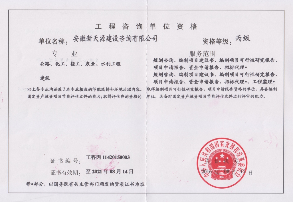 2012年3月取得安徽省發(fā)改委固定資產(chǎn)節(jié)能評估資質(zhì)證書;